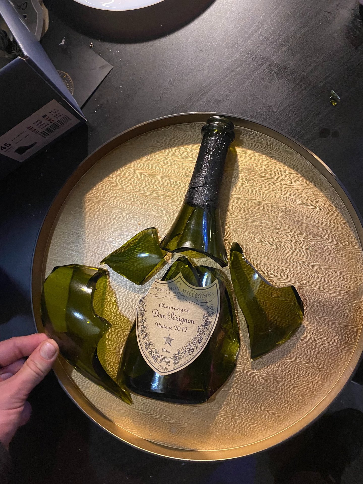 A keletkező üvegszilánkokat kézzel válogatjuk és rendezzük el, hogy a véletlenszerű törésből végül egy harmonikus kompozíció álljon össze. Az üveg tálcaformába kerül, amely egyszerre ad keretet az alkotásnak és finoman utal a vendéglátás világára.